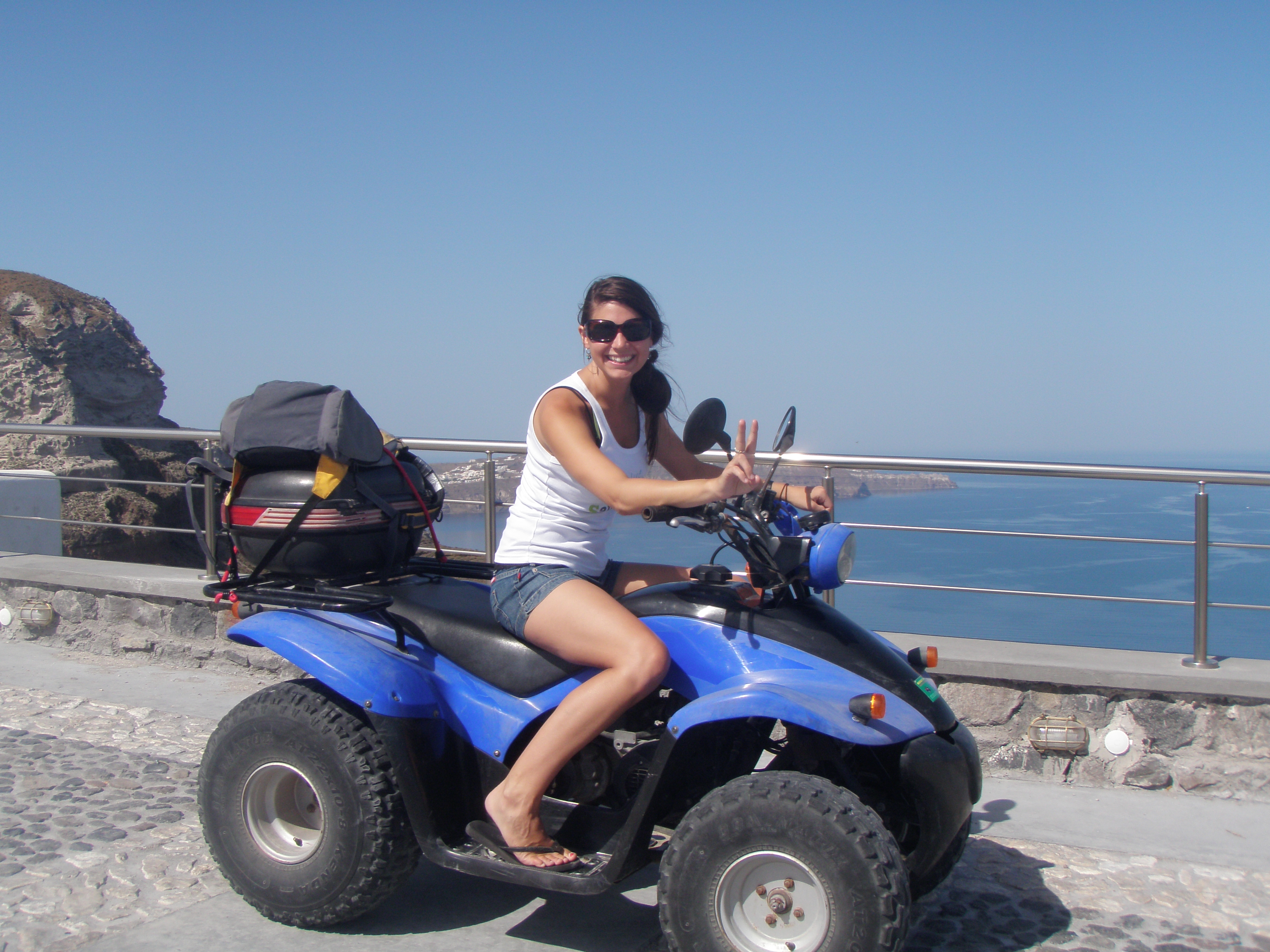 With that said, we did finally get a chance to go out and explore the island…so some of the tourist things! On one of my mornings off, Brad and I rented a quad and went all the way to Oia at the other end of the island! It was really really nice, with a paved side walk where no cars (or quads) can drive, which makes it sooo much better!